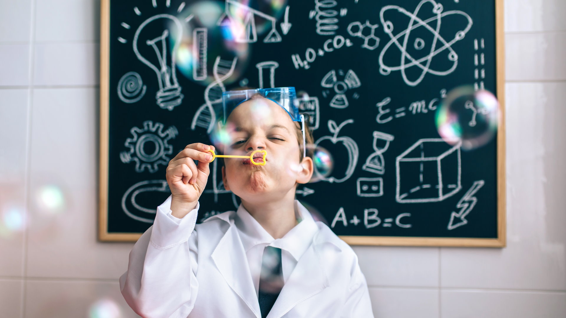 Chłopczyk dmuchający bańki mydlane przed tablicą szkolną