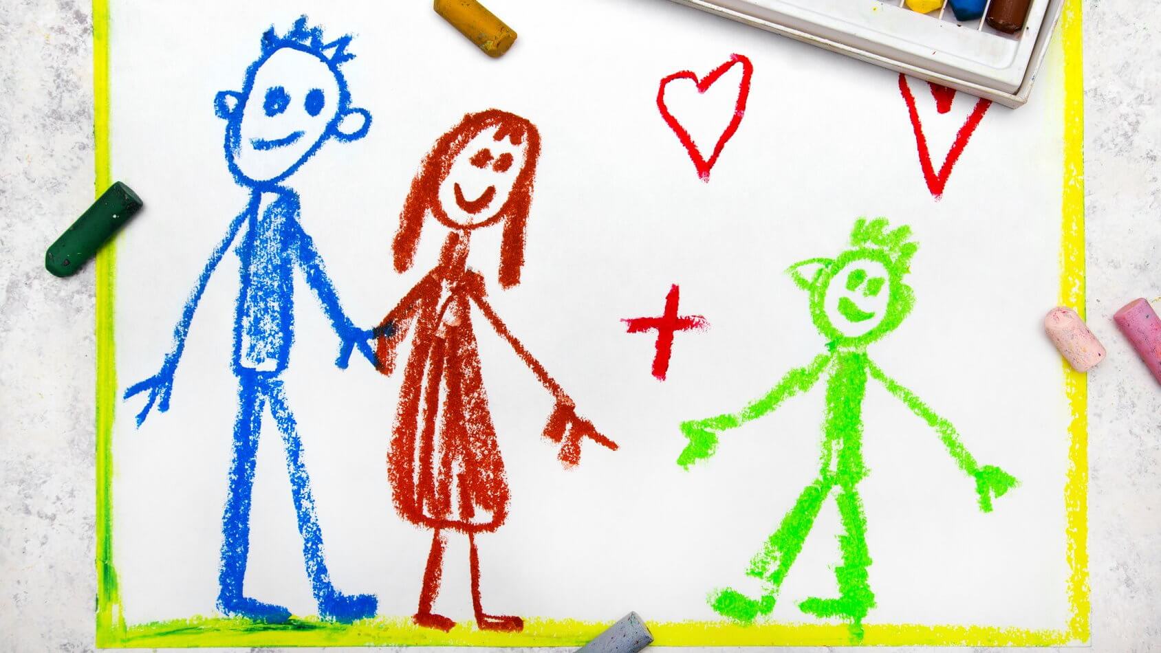 Rysunek dziecięcy przedstawiający rodziców z dzieckiem