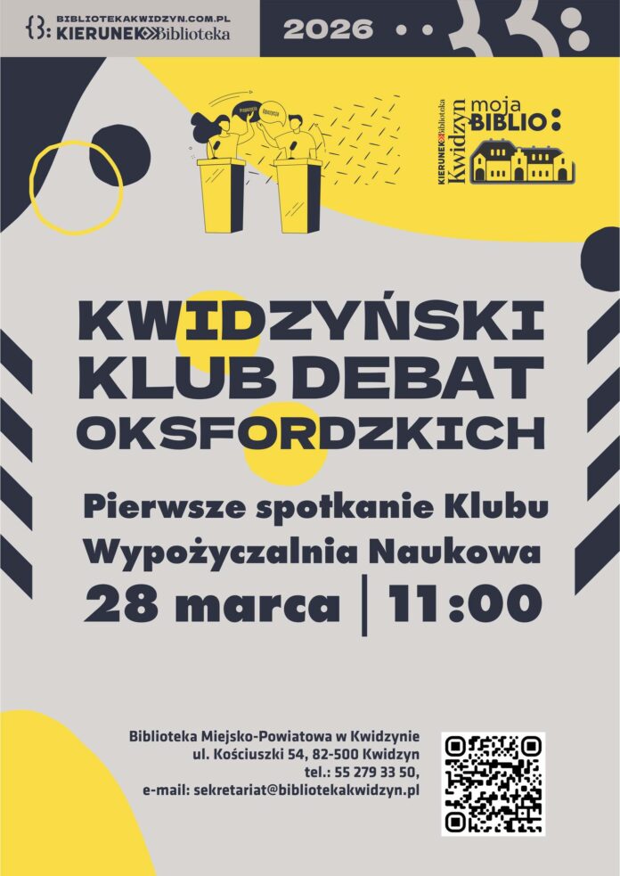 Biblioteka Miejsko-Powiatowa w Kwidzynie zaprasza młodzież do udziału w Klubie Kwidzyńskich Debat Oksfordzkich. Projekt skierowany jest do uczniów szkół ponadpodstawowych w wieku 15–18 lat z terenu powiatu kwidzyńskiego, którzy chcą rozwijać swoje umiejętności miękkie i społeczne.