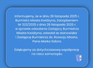 Informujemy, że w dniu 28 listopada 2025 r. Burmistrz Miasta Kwidzyna, Zarządzeniem