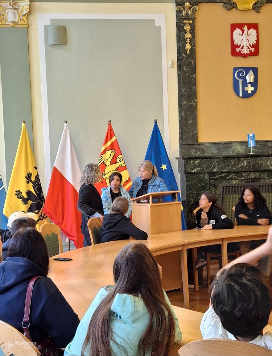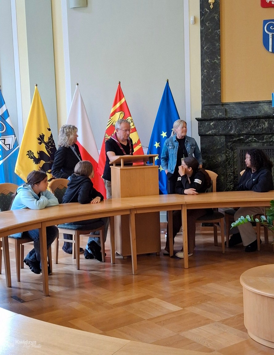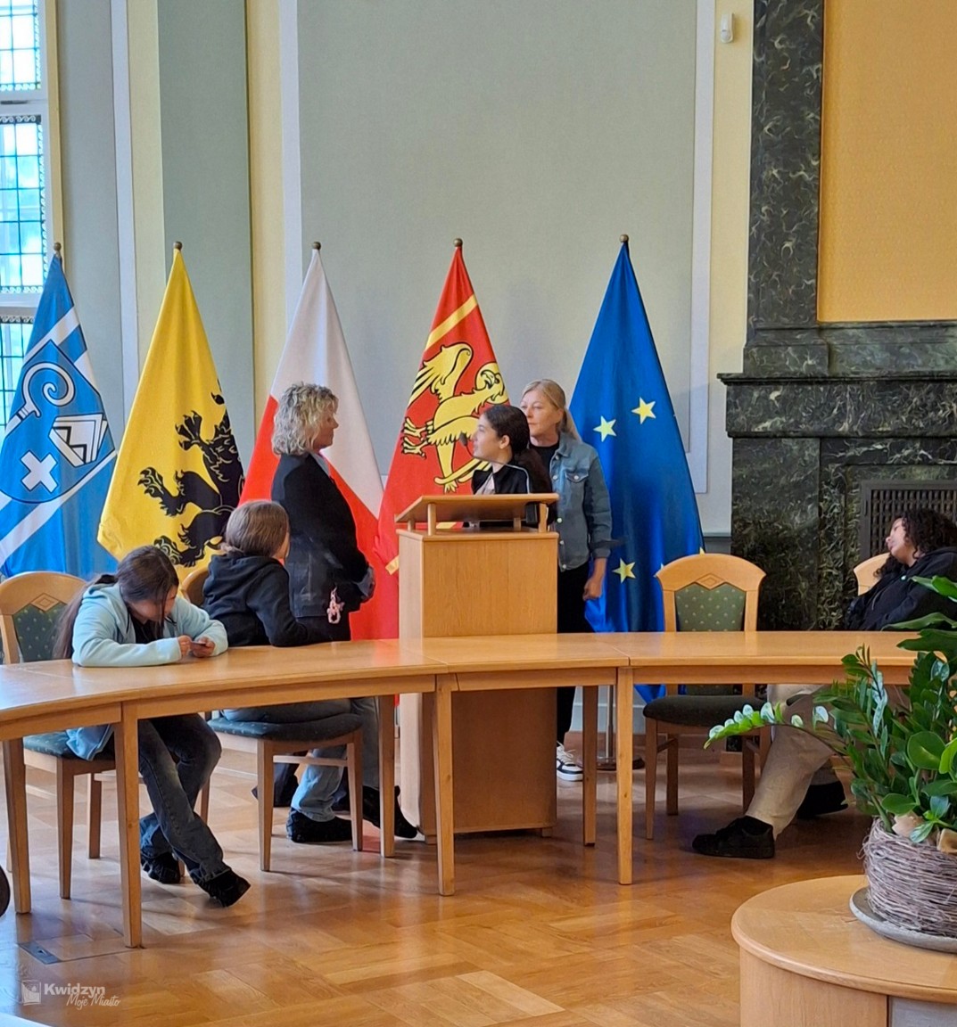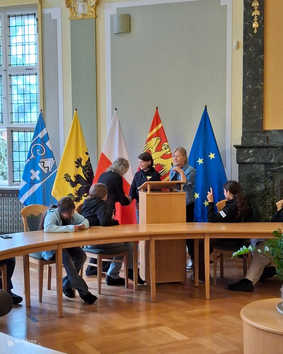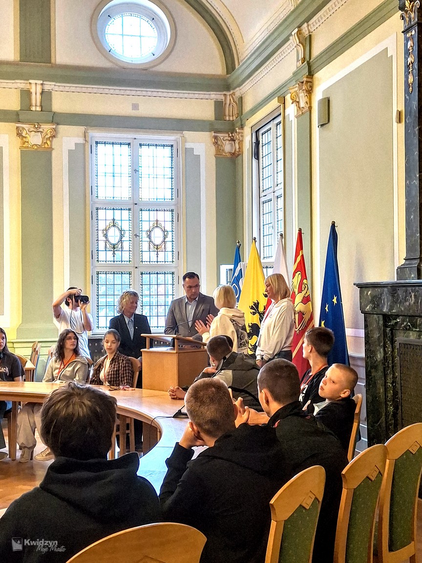 Nasi goście spotkali się również z Burmistrzem Miasta Kwidzyna – Sebastianem Kasztelanem, który chętnie opowiedział o zasadach funkcjonowania lokalnego samorządu i odpowiadał na pytania zadawane przez młodzież. Po wizycie w gabinecie burmistrza uczestnicy zwiedzili salę narad Rady Miejskiej oraz salę ślubów. Na pamiątkę tego miłego spotkania wszyscy uczestnicy i opiekunowie otrzymali okolicznościowe upominki.