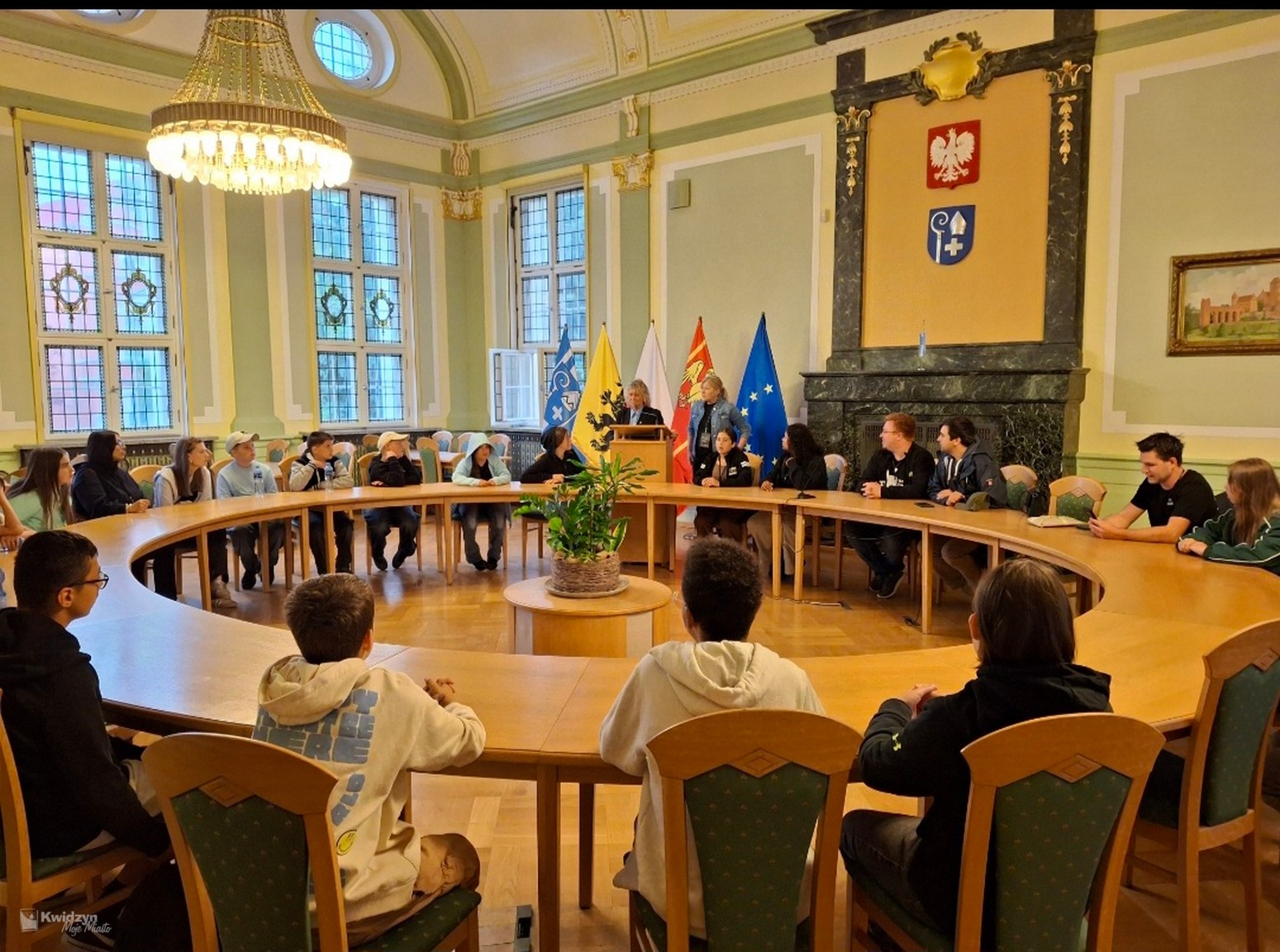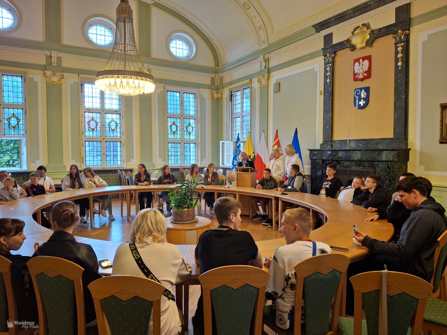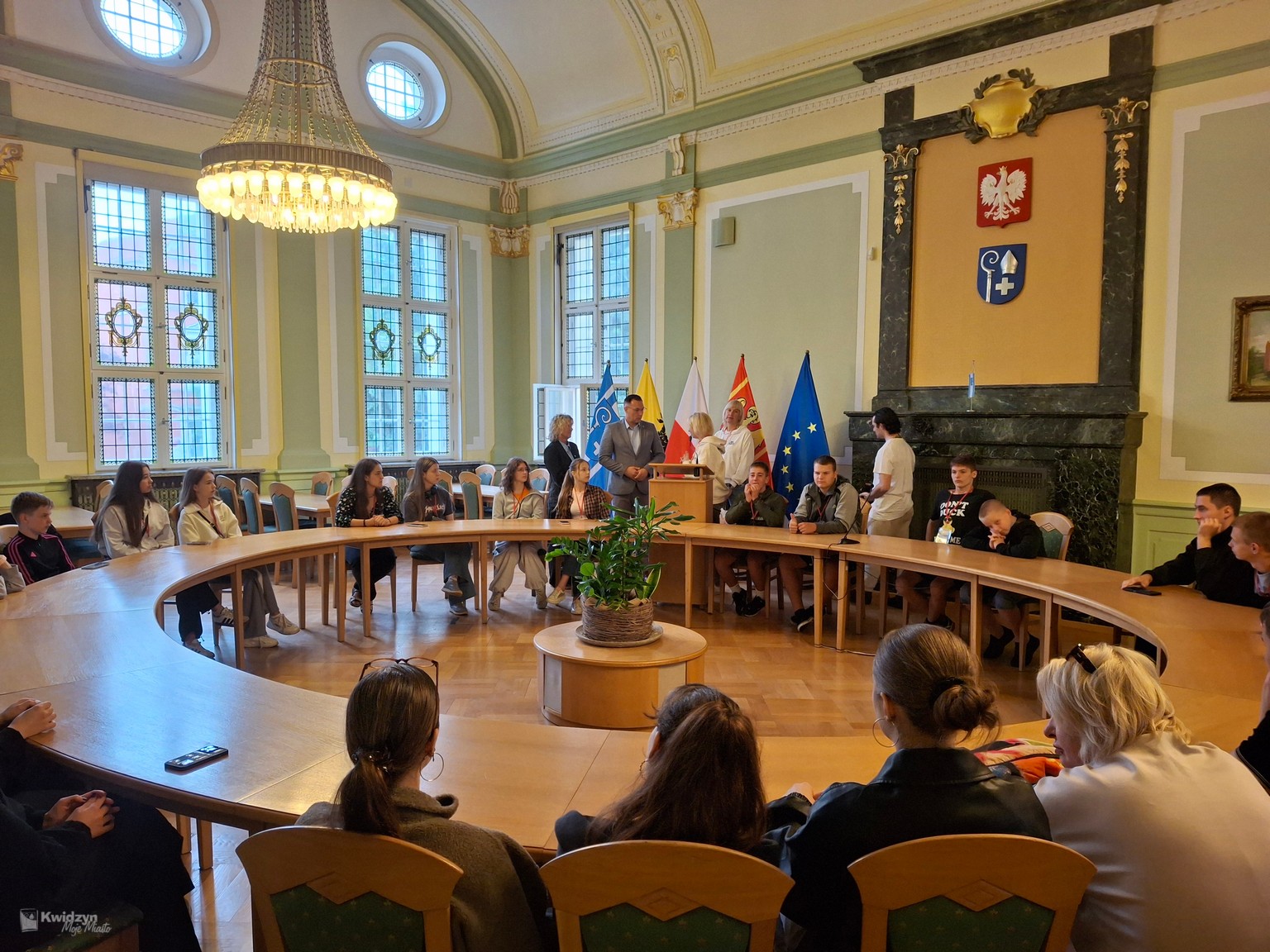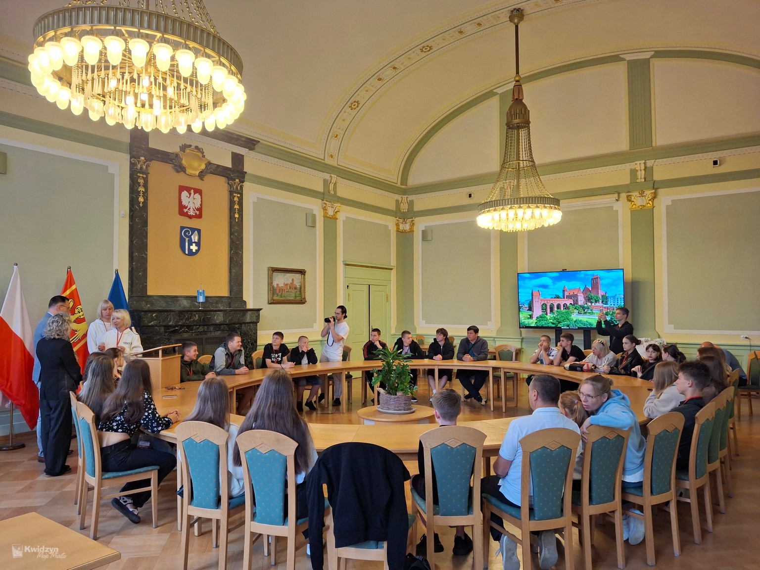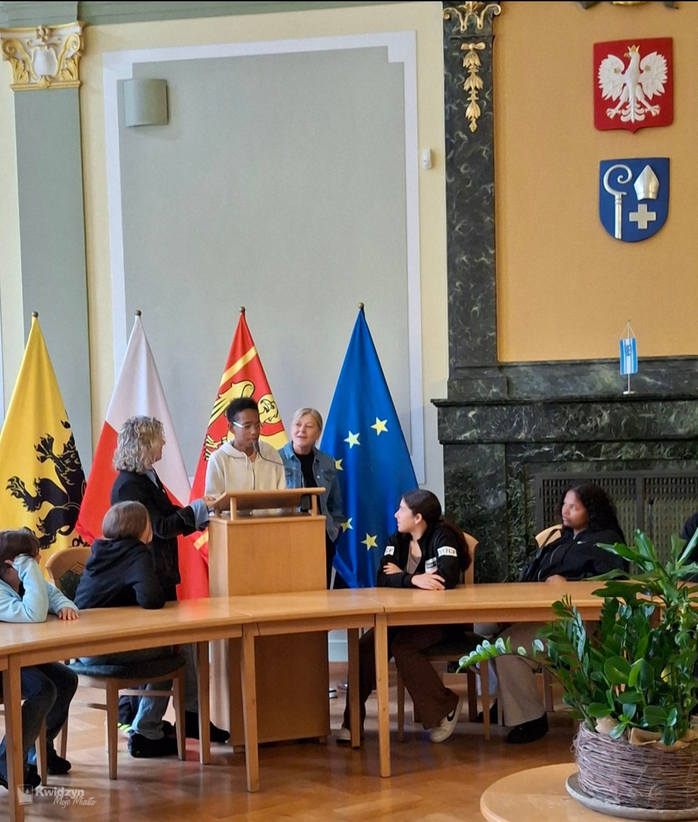 Nasi goście spotkali się również z Burmistrzem Miasta Kwidzyna – Sebastianem Kasztelanem, który chętnie opowiedział o zasadach funkcjonowania lokalnego samorządu i odpowiadał na pytania zadawane przez młodzież. Po wizycie w gabinecie burmistrza uczestnicy zwiedzili salę narad Rady Miejskiej oraz salę ślubów. Na pamiątkę tego miłego spotkania wszyscy uczestnicy i opiekunowie otrzymali okolicznościowe upominki.
