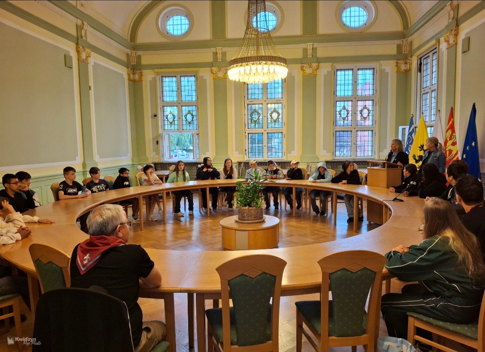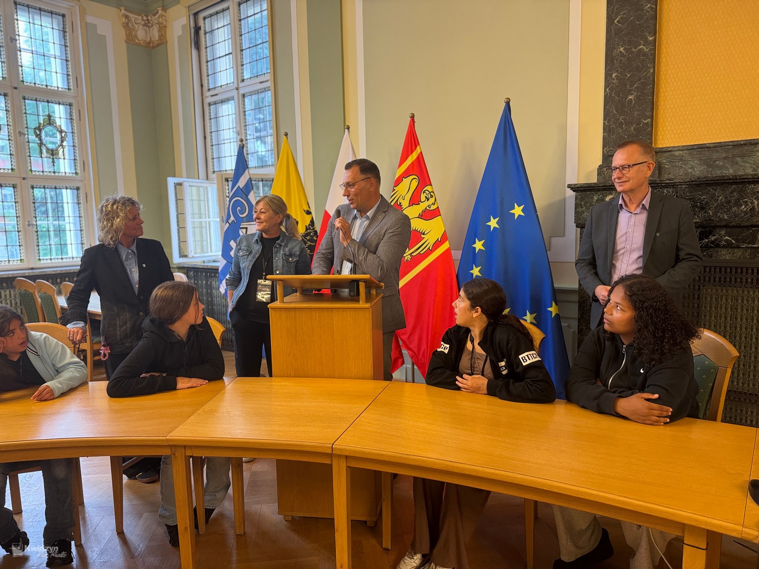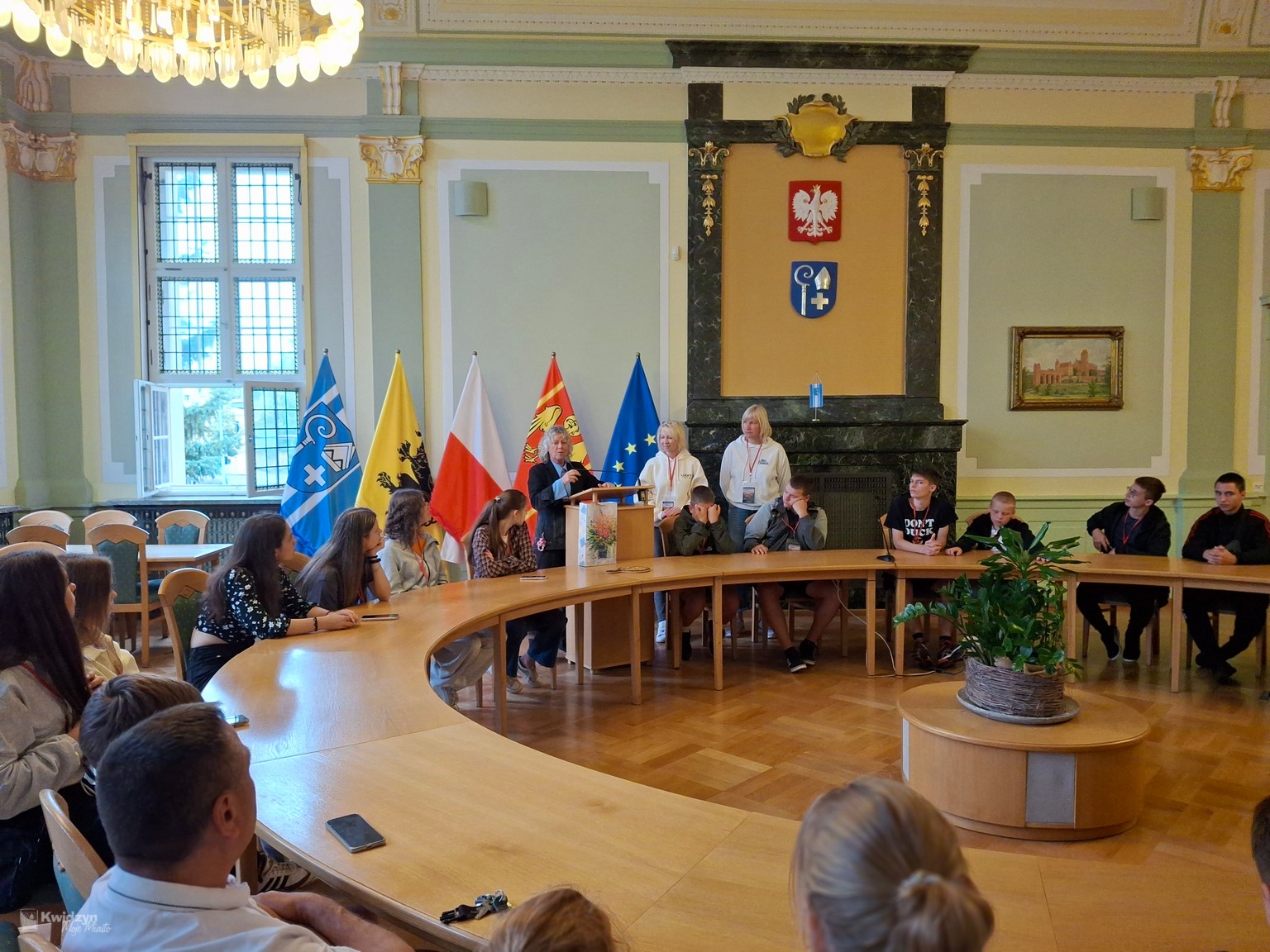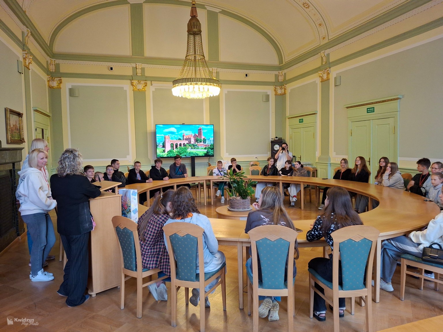 Nasi goście spotkali się również z Burmistrzem Miasta Kwidzyna – Sebastianem Kasztelanem, który chętnie opowiedział o zasadach funkcjonowania lokalnego samorządu i odpowiadał na pytania zadawane przez młodzież. Po wizycie w gabinecie burmistrza uczestnicy zwiedzili salę narad Rady Miejskiej oraz salę ślubów. Na pamiątkę tego miłego spotkania wszyscy uczestnicy i opiekunowie otrzymali okolicznościowe upominki.