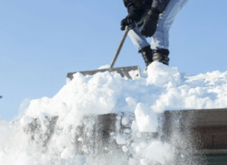 Usuwanie śniegu z dachów i odśnieżanie chodników.