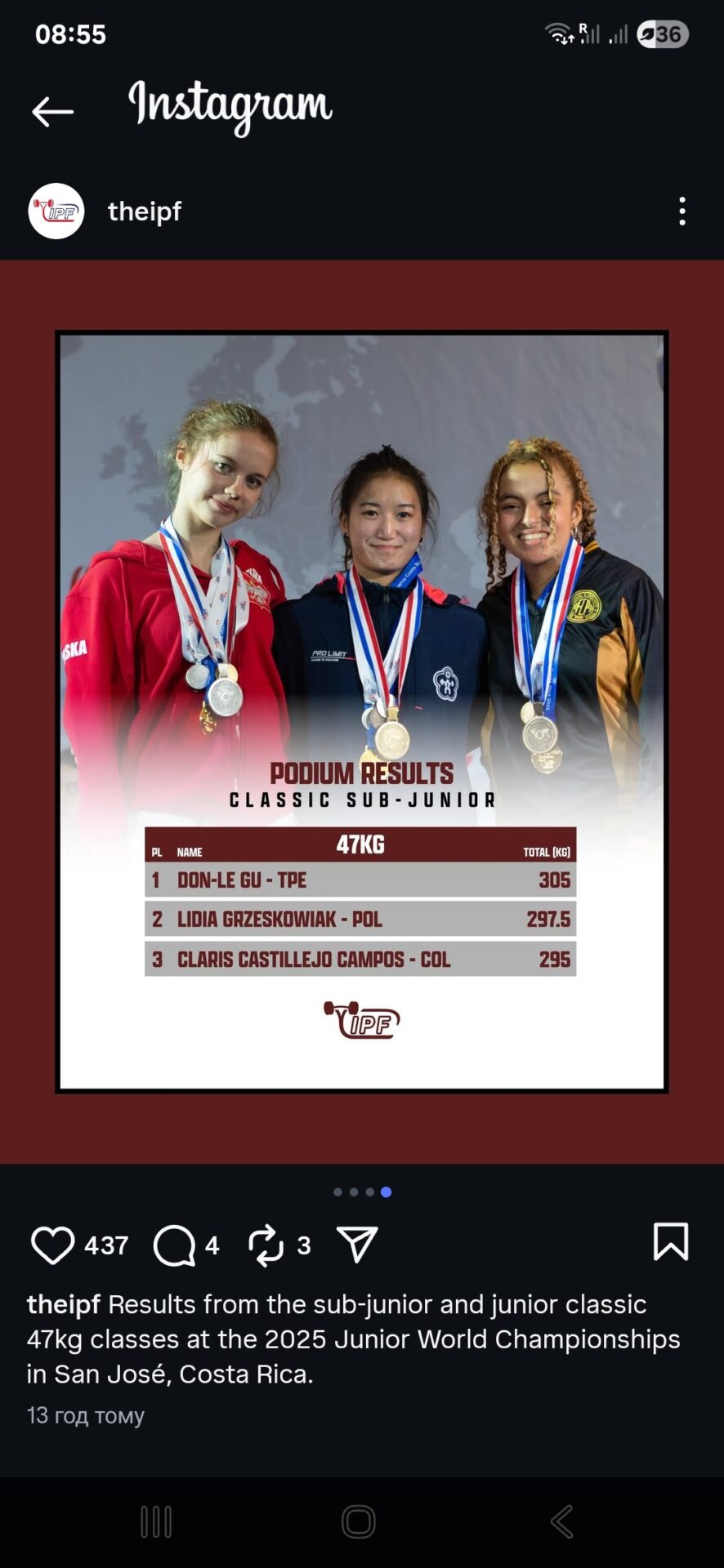 Lidia Grześkowiak, startowała w kategorii 47 kg Sub – Junior zdobyła srebrny medal w klasyfikacji generalnej –105 kg w przysiadzie 55 kg, w wyciskaniu leżąc 137,5 kg, w martwym ciągu – łącznie z wynikiem 297,5 kg.