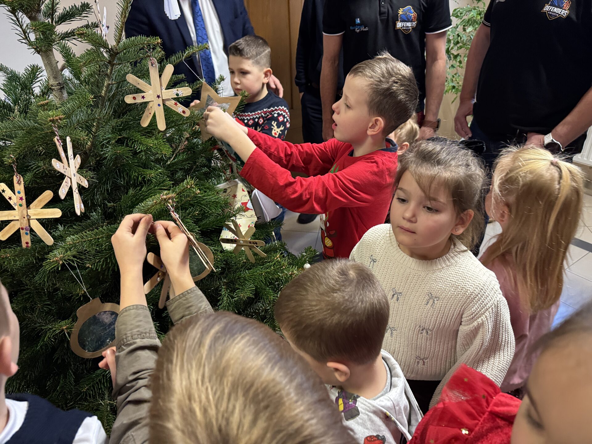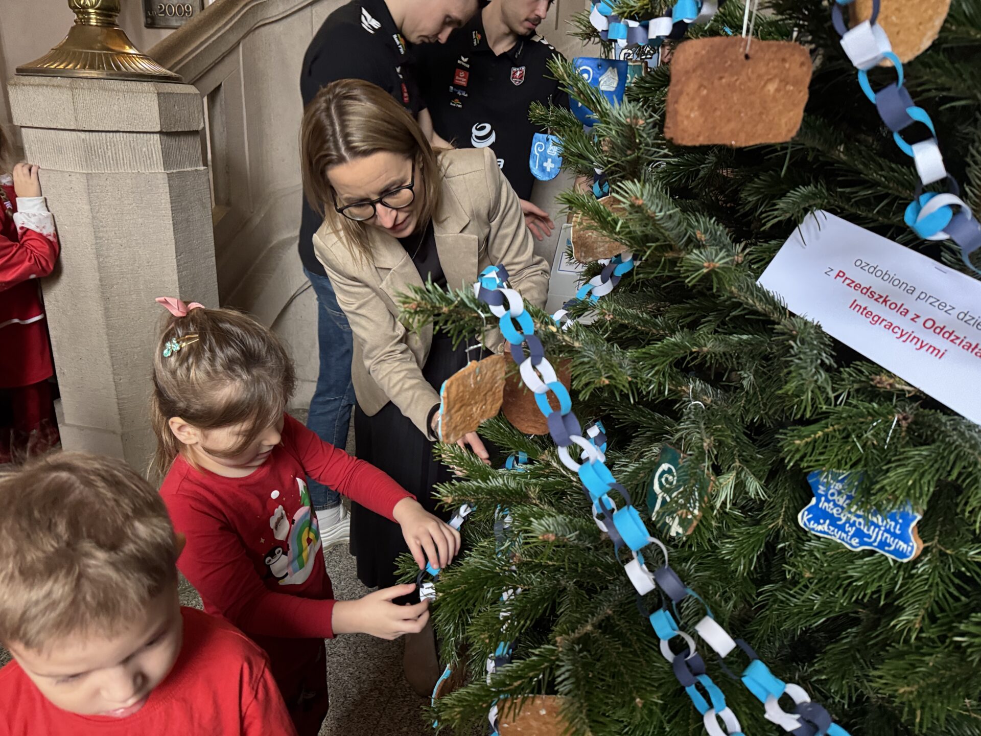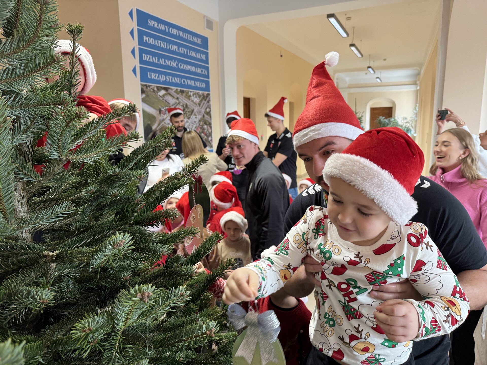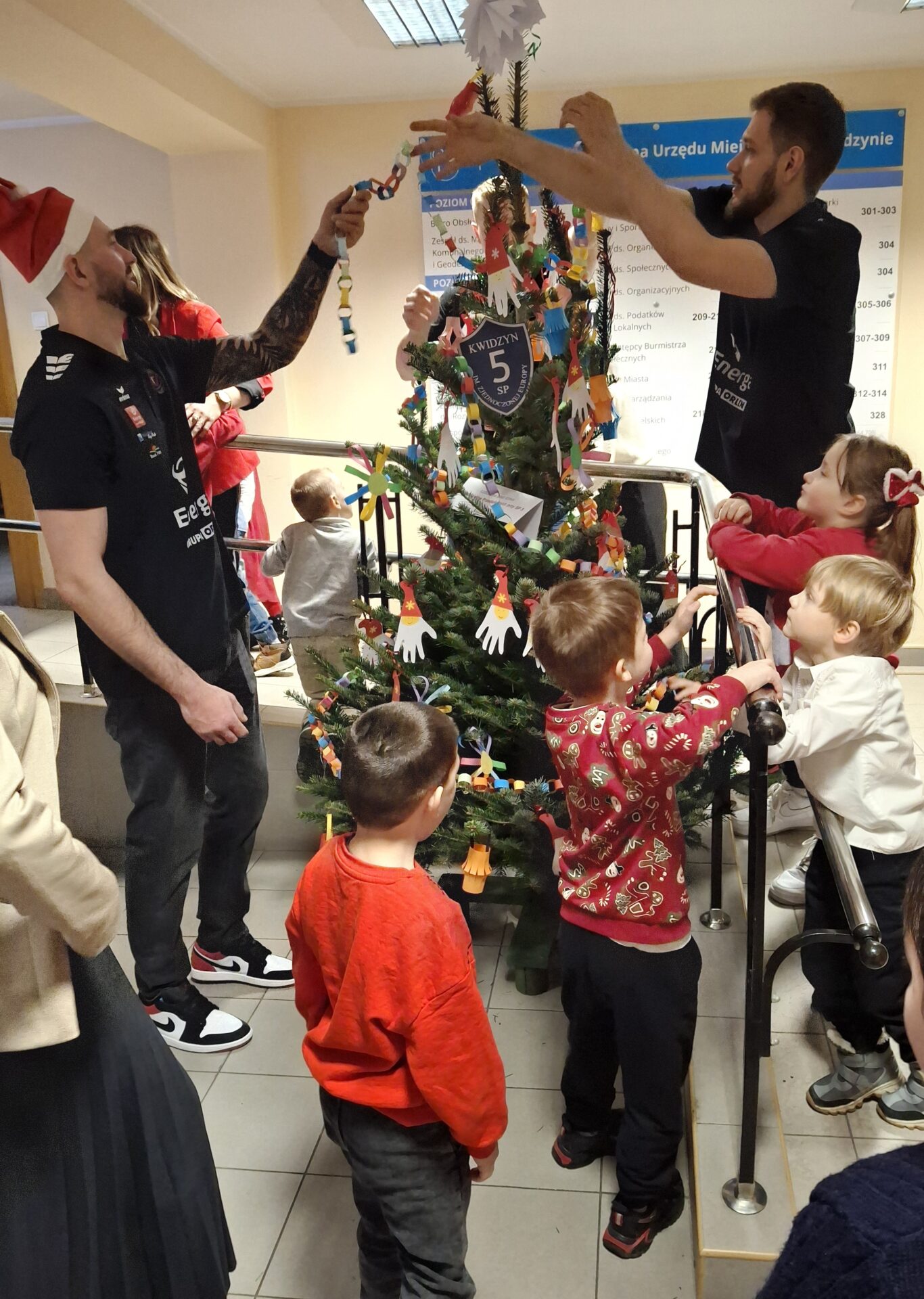 Zawodnicy chętnie pomagali wieszając ozdoby na wyższych gałązkach i dzieląc z dziećmi radość ze wspólnie tworzonego świątecznego klimatu.