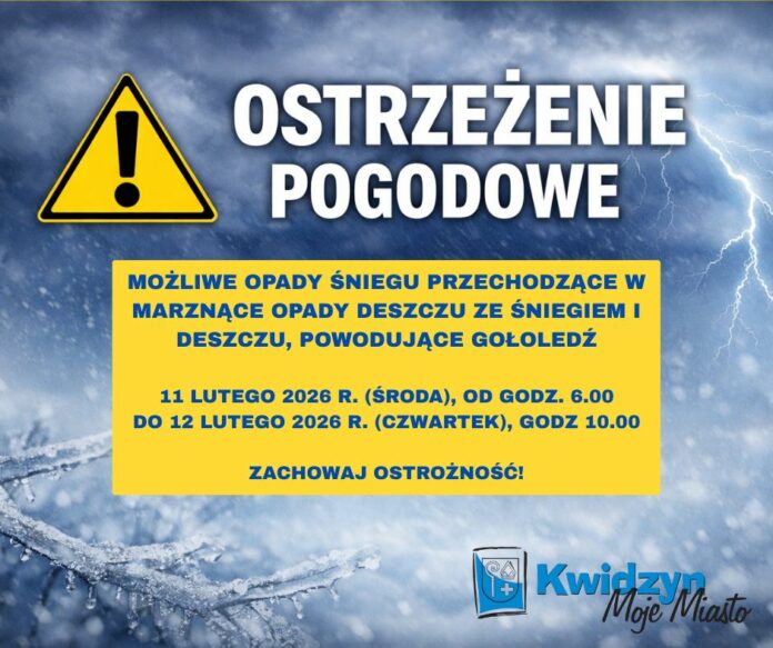 Instytut Meteorologii i Gospodarki Wodnej wydał ostrzeżenie meteorologiczne. Przewidywane są opady śniegu, przechodzące w marznące opady deszczu ze śniegiem i deszczu powodujące gołoledź. Ostrzeżenie dotyczy Miasta Kwidzyna oraz woj. pomorskiego.