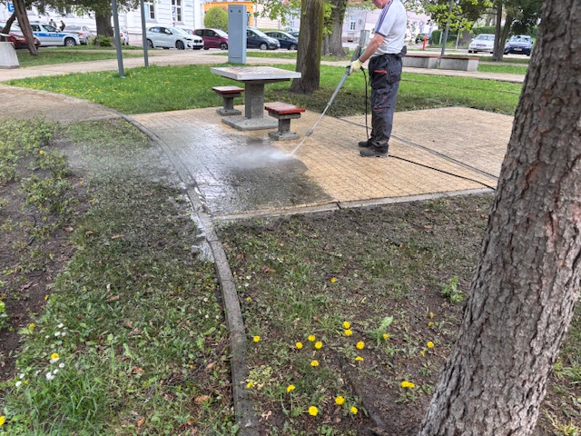 Zakres prac obejmuje przede wszystkim czyszczenie nawierzchni z kostki polbrukowej o łącznej powierzchni około 2500 m². Prace prowadzone są zarówno wokół fontanny, jak i na alejkach spacerowych. Wykorzystując myjki wysokociśnieniowe skutecznie usuwane są nagromadzone zanieczyszczenia, mchy oraz porosty. Różnica w wyglądzie nawierzchni jest natychmiast zauważalna – kostka odzyskuje swoje naturalne barwy, a przestrzeń staje się przyjazna dla mieszkańców.
