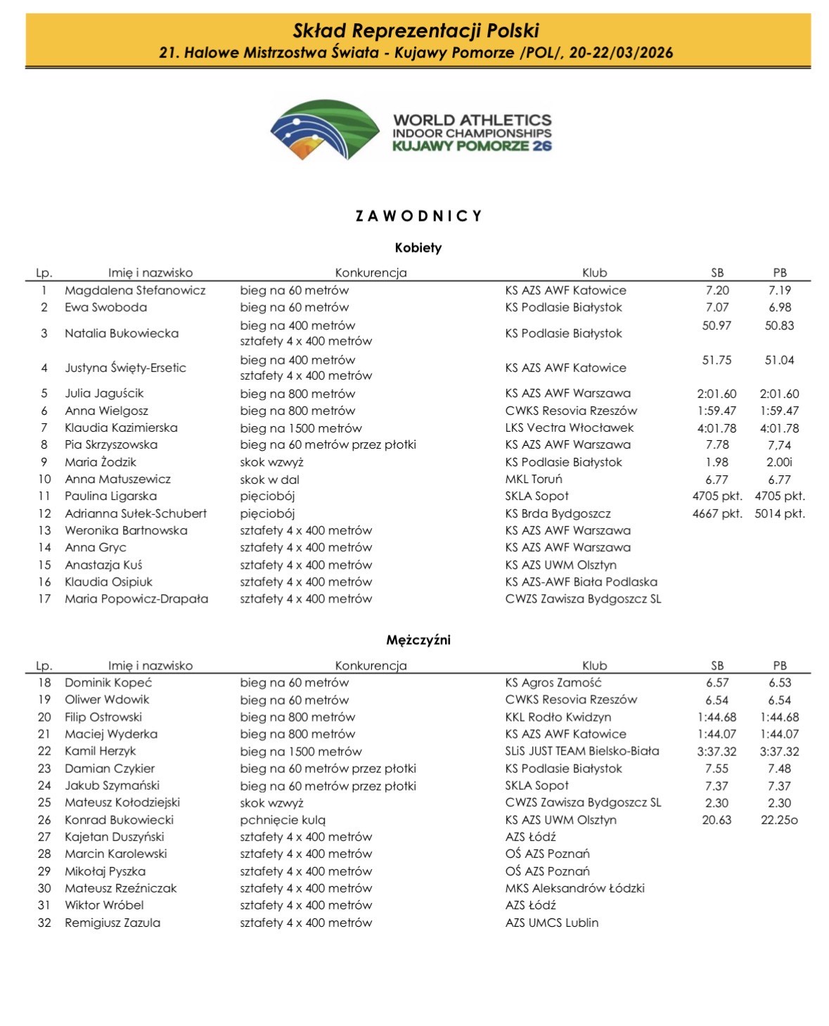 Reprezentant Kwidzyńskiego Klubu Lekkoatletycznego Rodło Filip Ostrowski otrzymał powołanie do Reprezentacji Polski na Halowe Mistrzostwa Świata Toruń 2026.