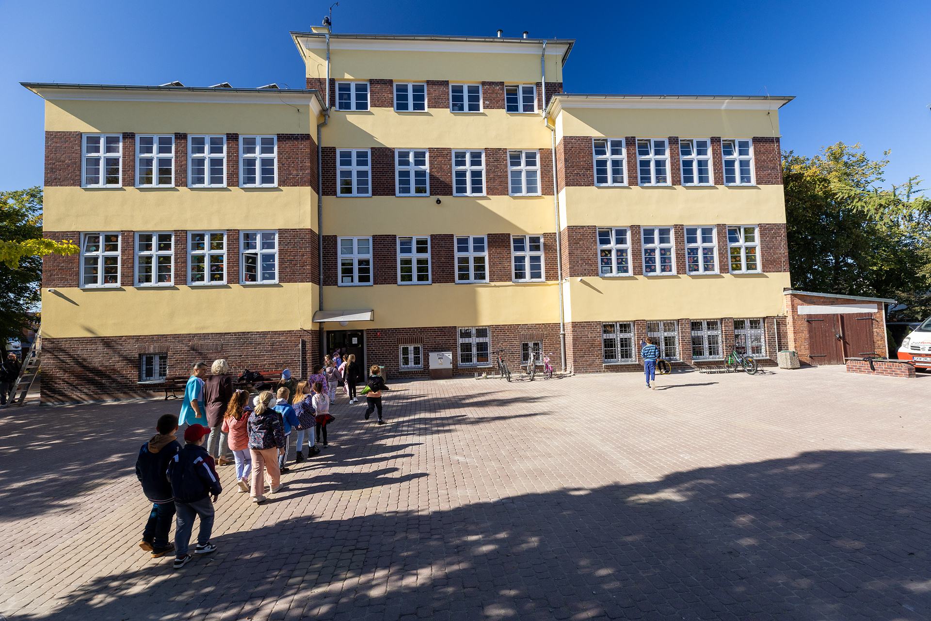 Zakres robót obejmuje wymianę stolarki okiennej i drzwiowej, docieplenie ścian zewnętrznych, wykonanie nowych obróbek blacharskich oraz docieplenie stropodachu szkoły.