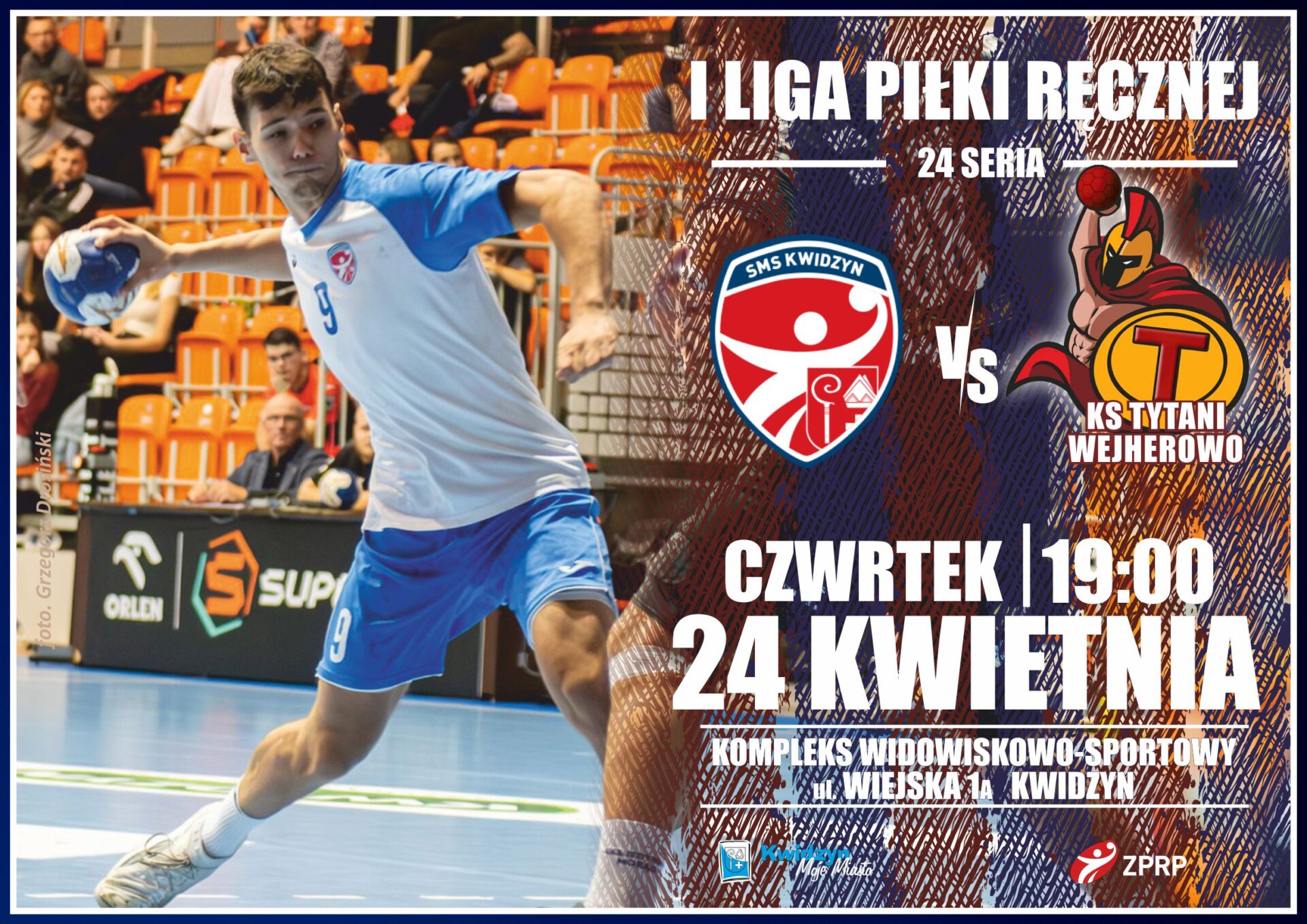 Zapraszamy na mecz I ligi piłki ręcznej mężczyzn pomiędzy zespołami: SMS KwidzynKS Tytani Wejherowo. Spotkanie odbędzie się w czwartek 24 kwietnia 2025 r. o godz. 19:00 w Hali Widowiskowo-Sportowej ul. Wiejska 1A w Kwidzynie.