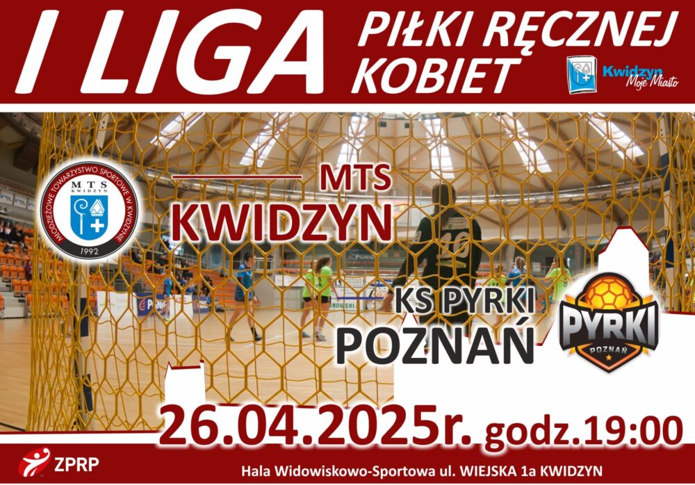 Serdecznie zapraszamy na mecz I ligi piłki ręcznej kobiet pomiędzy zespołami: MTS Kwidzyn – KS Pyrki Poznań. Spotkanie odbędzie się w sobotę 26 kwietnia 2025 r. o godz. 19:00 w Hali Widowiskowo-Sportowej ul. Wiejska 1A w Kwidzynie.