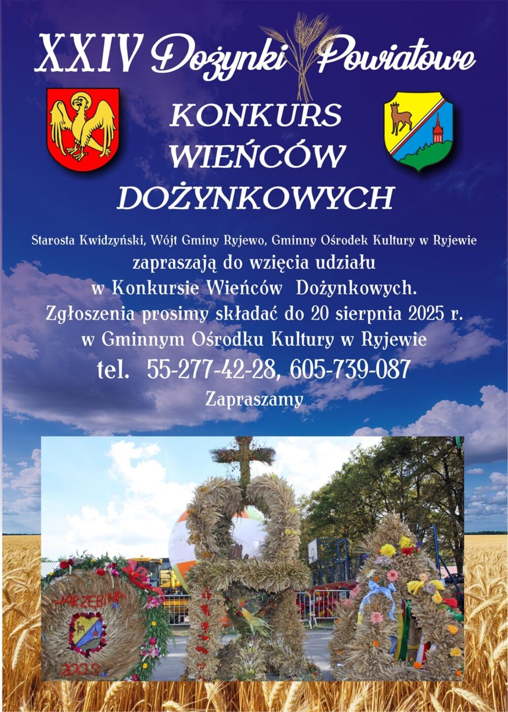 do udziału w Konkursie Wieńców Dożynkowych, który odbędzie się 31 sierpnia 2025 r. podczas XXIV Dożynek Powiatowych w Ryjewie.